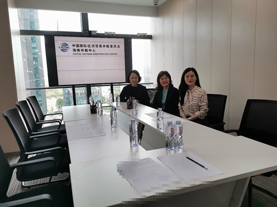 (自左向右:貿(mào)仲海南仲裁中心秘書長(zhǎng)王文英、獨(dú)任仲裁員岳潔、案件經(jīng)辦人余婷)