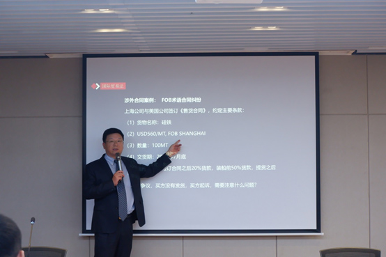 張振安律師以 “涉外經(jīng)貿(mào)合同法律風(fēng)險(xiǎn)和爭(zhēng)議解決”為題進(jìn)行了發(fā)言。他首先通過介紹一起真實(shí)案例,引出國(guó)際貨物貿(mào)易合同條款中當(dāng)事雙方可能忽略的問題。接著,梳理了國(guó)際貨物貿(mào)易合同的簽訂流程,對(duì)每一環(huán)節(jié)可能存在的風(fēng)險(xiǎn)點(diǎn)進(jìn)行了逐一講解,并結(jié)合我國(guó)民法典、國(guó)際貿(mào)易術(shù)語解釋通則(INCOTERMS)、聯(lián)合國(guó)國(guó)際貨物銷售合同公約(CISG)和跟單信用證統(tǒng)一慣例(UCP600),從國(guó)內(nèi)和國(guó)際兩個(gè)層面,對(duì)企業(yè)規(guī)避簽訂涉外貨物買賣合同過程中的風(fēng)險(xiǎn)給出了建議。最后,張律師通過對(duì)比仲裁與訴訟的區(qū)別,對(duì)仲裁作為爭(zhēng)議解決方式之一在國(guó)際貿(mào)易領(lǐng)域的優(yōu)勢(shì)進(jìn)行了詳細(xì)說明,并向現(xiàn)場(chǎng)參會(huì)者推薦了貿(mào)仲江蘇中心的示范仲裁條款。