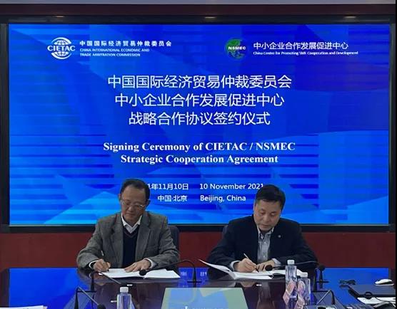 2021年11月10日,中國(guó)國(guó)際經(jīng)濟(jì)貿(mào)易仲裁委員會(huì)(“貿(mào)仲”)與中小企業(yè)合作發(fā)展促進(jìn)中心(“中促中心”)戰(zhàn)略合作協(xié)議簽約儀式在北京成功舉行。貿(mào)仲王承杰副主任兼秘書長(zhǎng)、中促中心黎志明主任代表雙方在戰(zhàn)略合作協(xié)議上簽字。