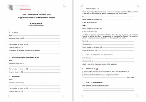 申請中應(yīng)包括以下內(nèi)容:被質(zhì)疑的決定的副本(如有);對申請所依據(jù)的事實和法律論據(jù)的簡要說明;申請人的救濟請求;申請中止被質(zhì)疑的決定的效力,或申請任何其他極為緊急的初步救濟(如有);對CAS臨時仲裁庭管轄權(quán)的依據(jù)的意見;申請人及/或其代理人的聯(lián)系方式和通訊地址。