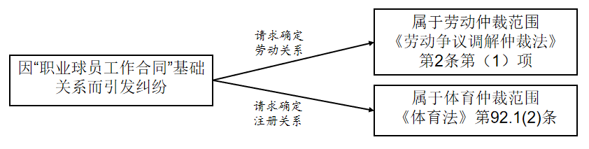職業(yè)球員是俱樂部勞動(dòng)者,但是從事特殊勞動(dòng)勞動(dòng)者,因此職業(yè)球員不僅具有勞動(dòng)者身份,也是球員的特殊勞動(dòng)者身份。因此,依據(jù)球員訴請的內(nèi)容,來判斷管轄:如請求確認(rèn)勞動(dòng)者身份,即勞動(dòng)關(guān)系確認(rèn)(勞動(dòng)爭議調(diào)解仲裁法第二條第(1)項(xiàng)“因確認(rèn)勞動(dòng)關(guān)系發(fā)生的爭議”),屬于勞動(dòng)仲裁范圍;如請求確認(rèn)球員身份(特殊勞動(dòng)者),即要求明確球員的注冊身份問題(體育法第九十二條第1款第(2)項(xiàng)“因運(yùn)動(dòng)員注冊、交流發(fā)生的糾紛”),則屬于體育仲裁范圍,如下圖。