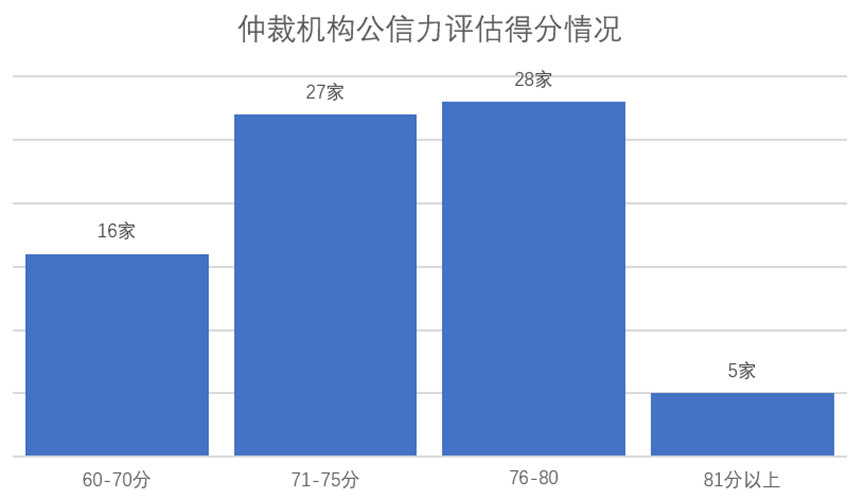 從一級指標得分情況來看,受調研仲裁機構表現(xiàn)較好的指標是案件管理。該指標主要依據(jù)是仲裁用戶的主觀滿意度評價。這表明機構所在地的當事人對本地機構的評價較高。我國仲裁發(fā)展不平衡,仲裁資源本地化程度較高,滿意度指標橫向可比性較低。該指標主要反映機構所在地當事人對該仲裁機構的看法。一級指標中得分最低的是仲裁裁決,僅為71.5分。仲裁裁決指標的評估標準主要是當事人向法院申請撤銷仲裁裁決與仲裁機構受案數(shù)量比、法院實際撤裁與當事人申請撤裁案件數(shù)量比以及法院實際撤裁案件與仲裁機構受理案件數(shù)量比。該項指標評估依據(jù)來源權威,效度較高,可以部分反映仲裁公信力建設的實際情況。