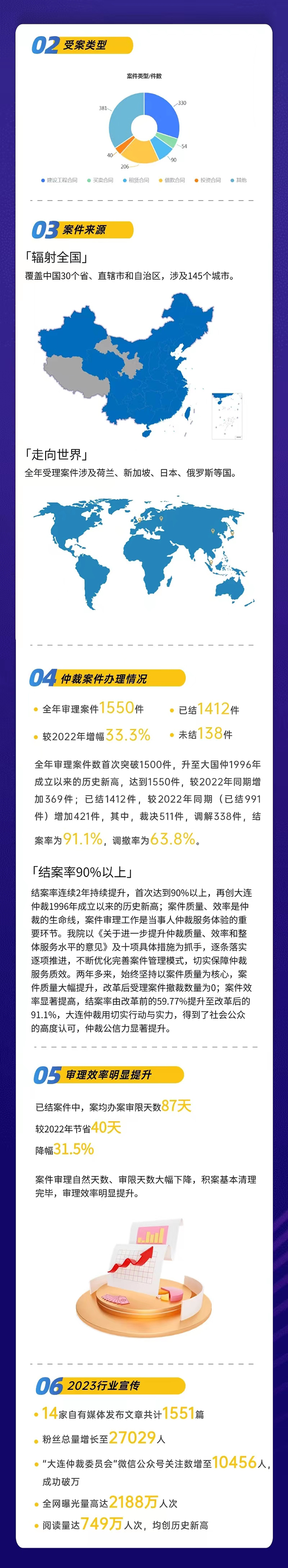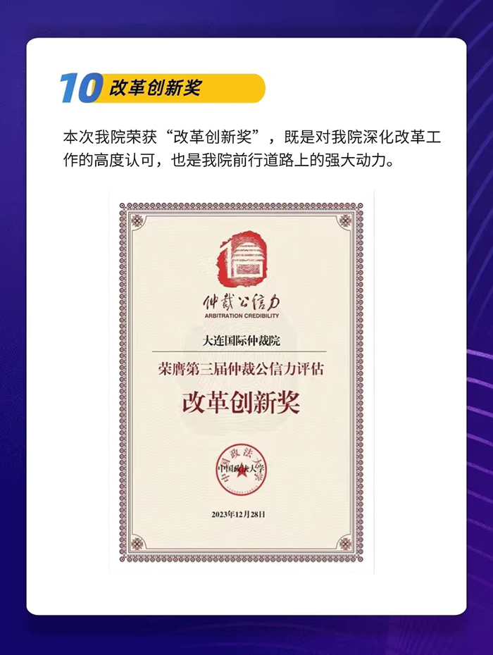2023年,是大連國際仲裁院(大連仲裁委員會)順利完成體制機制改革的第三個年頭。大連國際仲裁院堅定不移在法治軌道上推進大連仲裁發(fā)展體系和能力現(xiàn)代化。全年仲裁業(yè)務(wù)實現(xiàn)跨越式發(fā)展,辦案質(zhì)效全面提升,公共法律服務(wù)平臺的輻射面持續(xù)擴大,機構(gòu)品牌的影響力和公信力不斷增強。在推進東北亞國際仲裁中心建設(shè),營造優(yōu)質(zhì)的法治化營商環(huán)境,擦亮“大連仲裁”的金字招牌上邁出堅實步伐。