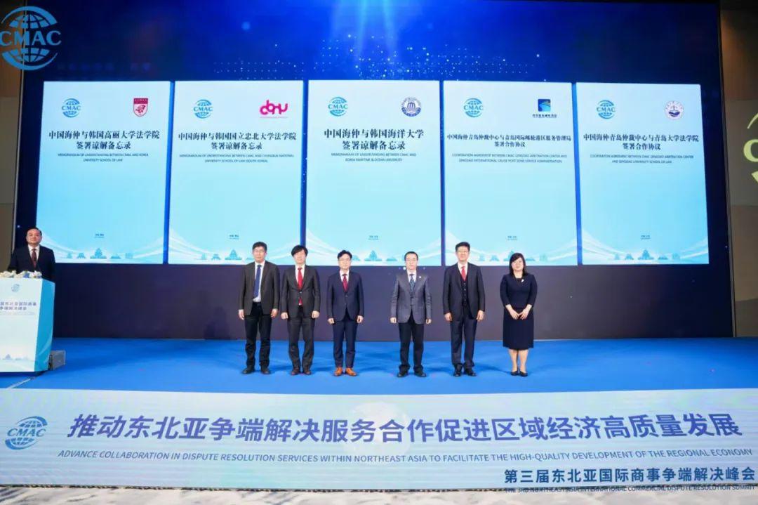 開幕式后,在現(xiàn)場(chǎng)嘉賓見證下,中國(guó)海仲分別與韓國(guó)海事海洋大學(xué)、韓國(guó)高麗大學(xué)法學(xué)院、韓國(guó)國(guó)立忠北大學(xué)法學(xué)院簽署諒解備忘錄;中國(guó)海仲青島仲裁中心分別與青島國(guó)際郵輪港區(qū)服務(wù)管理局、青島大學(xué)法學(xué)院簽訂合作協(xié)議。成果發(fā)布環(huán)節(jié)由山東省貿(mào)促會(huì)會(huì)長(zhǎng)孟向東主持。