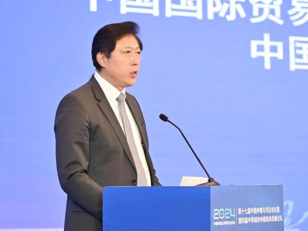 (中國國際貿(mào)易促進(jìn)委員會黨組成員、副會長、中國仲裁法學(xué)研究會會長于健龍作開幕致辭)
