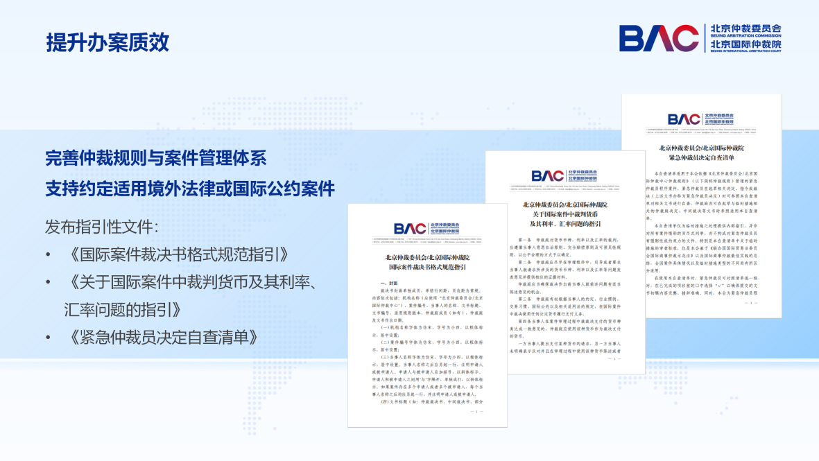 近五年來,北仲處理了大量約定適用境外法律或國際公約,以及以外語為仲裁語言的案件,具備處理復(fù)雜國際商事爭議的全球化思維及豐富的經(jīng)驗,能夠滿足境內(nèi)外當(dāng)事人的多元爭議解決需求。北仲還發(fā)布了與國際主流實(shí)踐接軌的指引性文件并在實(shí)踐中廣泛適用,比如發(fā)布了《國際案件裁決書格式規(guī)范指引》《關(guān)于國際案件中裁判貨幣及其利率、匯率問題的指引》《緊急仲裁員決定自查清單》等。