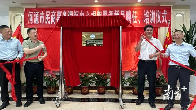 河源市司法局黨組書記、局長李慶鐸,河源市民政局黨組成員、二級調(diào)研員李琦,河源市民商事務(wù)調(diào)解中心理事長、河源仲裁委員會主任藍(lán)鋒,河源市民商事務(wù)調(diào)解中心秘書長吳松為調(diào)解中心揭牌。