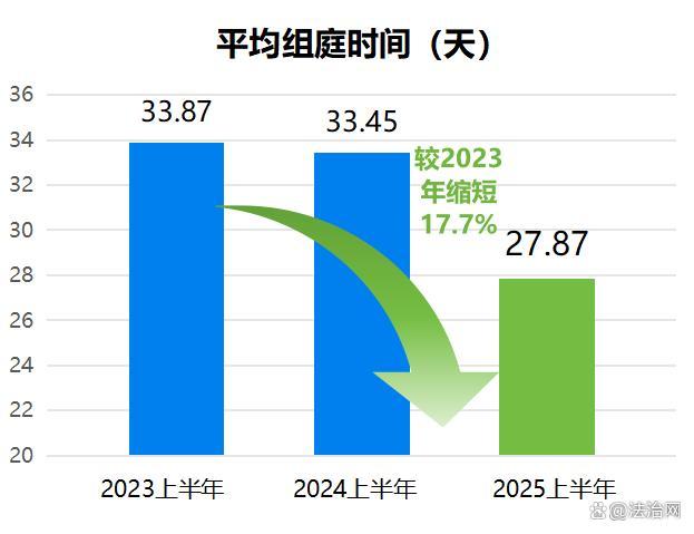 2025年上半年平均組庭時間壓縮至27.87天,較2024年上半年的33.45天縮短16.7%,較2023年上半年的33.87天縮短17.7%。通過組庭耗時的持續(xù)壓縮,案件進入實體審理環(huán)節(jié)的效率大幅提升,為案件高效審理奠定了堅實基礎。