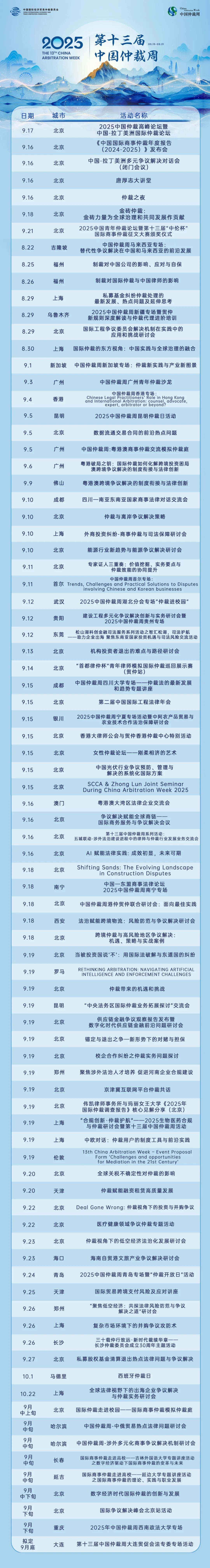 2025年中國(guó)仲裁周32城85場(chǎng)活動(dòng)推告如下: