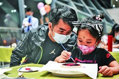成都博物館,家長帶小朋友在夜間體驗成都漆器制作。新華社發(fā)