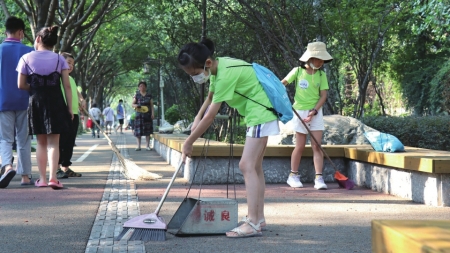 小小“職業(yè)體驗(yàn)官”清掃路面。