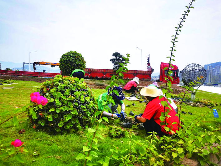 日前,記者在王牌路口節(jié)點看到,園林工人們正在這里換種鮮花,將草坪中間造型上布滿四季海棠,讓鮮花形成鮮艷的花球。在天仙湖攔砂壩,鞍式花箱中替換成了太陽花,花朵盛開嬌艷美麗,與仍在綻放的三角梅相映成趣,在城市高樓長街、萬安大橋、一江碧水的大背景下自成風(fēng)景線。