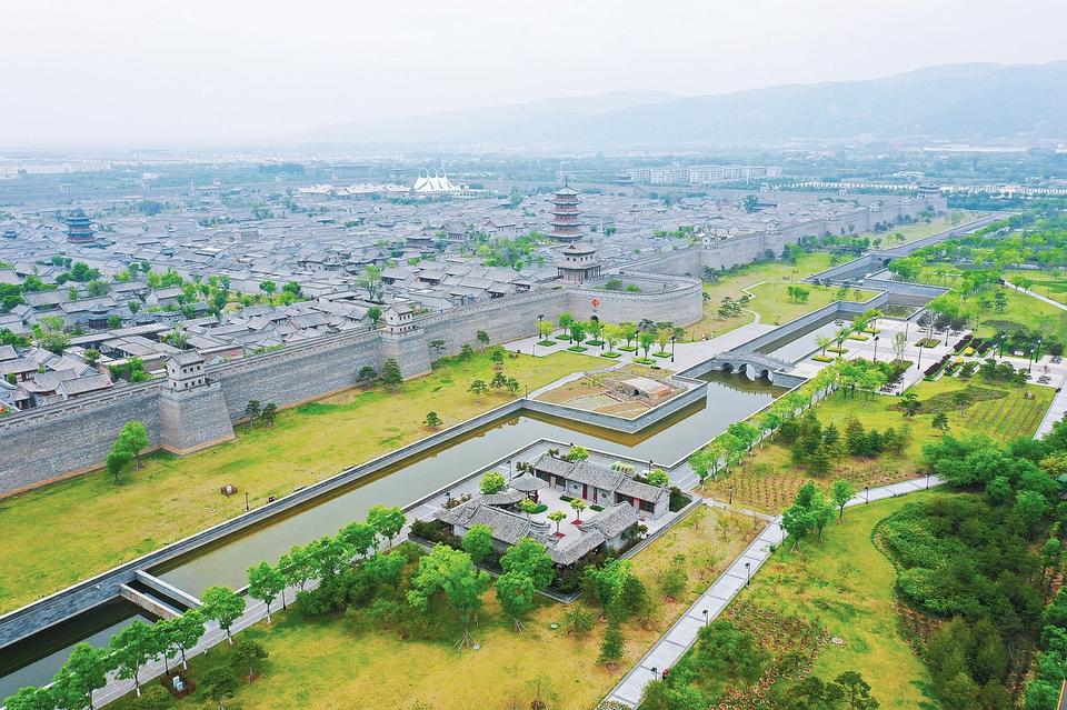 5月9日,遠(yuǎn)眺之下,太原古縣城內(nèi)外,綠樹環(huán)抱,一派綠意盎然的美麗景象。入夏以來(lái),古縣城景區(qū)與古城公園的生態(tài)美景遙相呼應(yīng),處處生機(jī)勃勃。(記者 阮洋 攝)