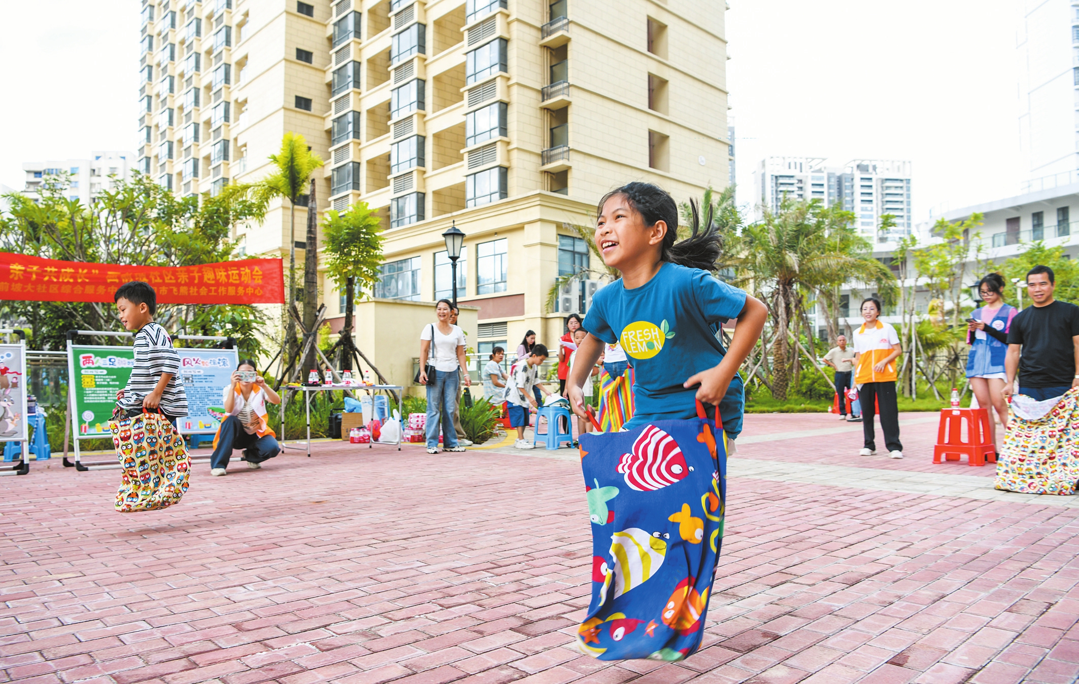9月16日,在面前坡社區(qū)組織開展的親子趣味運動會上,小朋友正在參加“歡樂袋鼠跳”游戲。記者 康登淋 攝