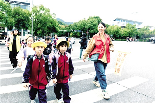 吉首市交警女子護學(xué)崗隊員護送學(xué)生過馬路。 楊賢清 攝