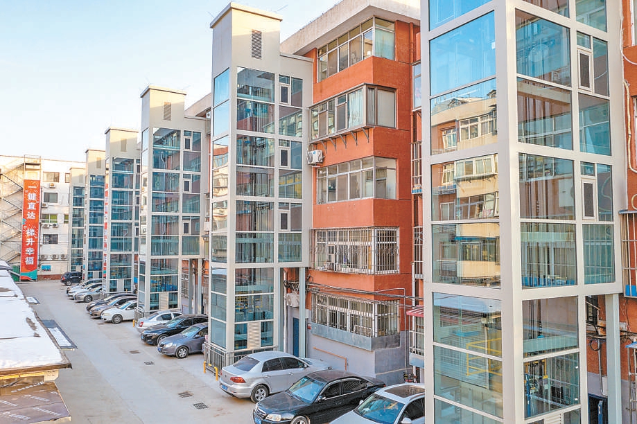 寒冬時節(jié),走進石景山區(qū)金四區(qū)教工樓小區(qū),樓北側的新電梯整齊劃一?!爸挥酶囊淮?,屋里暖和了,電梯加上了,地下的排水熱力管道也要通通換新,挺好!”提起改造,已近古稀之年的居民王振相連連稱贊。