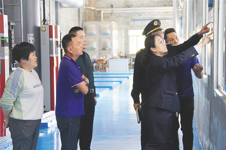 陽(yáng)光照進(jìn)鍋爐房?jī)?nèi),身穿藍(lán)色工服的工人做著日常維護(hù),瓊海市綜合行政執(zhí)法局工作人員在開展檢查。