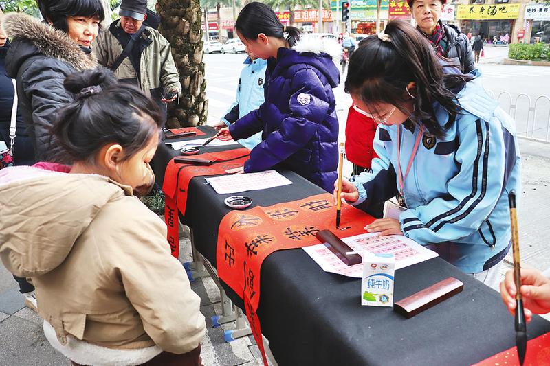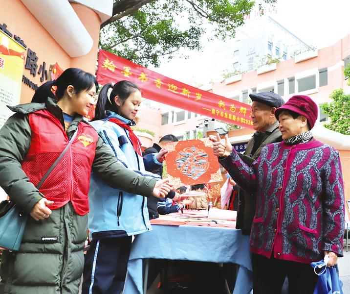 春聯(lián)寓意著人們對美好生活的向往和祝福,既是一種傳統(tǒng)文化的表達,也是一種節(jié)日氛圍的營造,讓人們在新的一年里充滿喜悅和希望。連日來,南寧市各中小學(xué)利用寒假開展形式多樣的活動,組織師生或走上街頭參加志愿服務(wù)活動,為社區(qū)群眾送上新春的祝福,或在家寫春聯(lián)和“福”字,為即將來臨的新春佳節(jié)增添濃濃的喜慶氛圍。