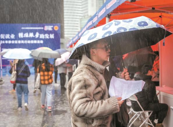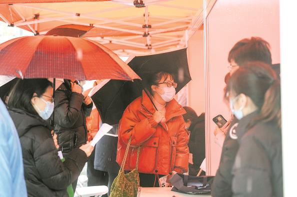 2月21日,“春風(fēng)行動(dòng)”招聘活動(dòng)在鐵路上海站北廣場(chǎng)舉辦。盡管天氣不佳,仍吸引了眾多求職者 記者 陳夢(mèng)澤 攝
