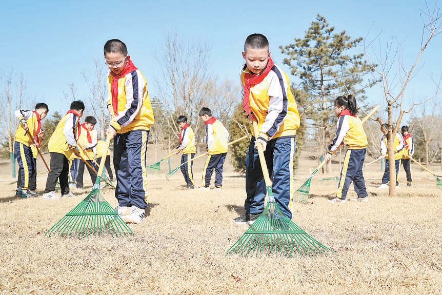 3月12日上午,“運(yùn)河小林長3·12綠地大掃除”在城市綠心森林公園舉行。北京第二實(shí)驗(yàn)小學(xué)通州分校的學(xué)生們學(xué)習(xí)義務(wù)植樹知識(shí),并進(jìn)行現(xiàn)場撫育管護(hù)活動(dòng)。記者 白繼開 攝