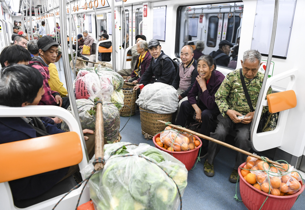 圖為菜農乘坐重慶軌道交通4號線,前往城區(qū)的菜市場售賣農產品。(記者 王全超 攝)