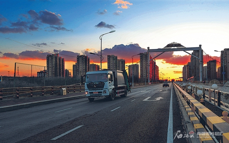 4月5日,落日余暉下,王秋云駕駛著清運(yùn)車行駛在烏魯木齊經(jīng)濟(jì)技術(shù)開發(fā)區(qū)(頭屯河區(qū))金風(fēng)大橋上。