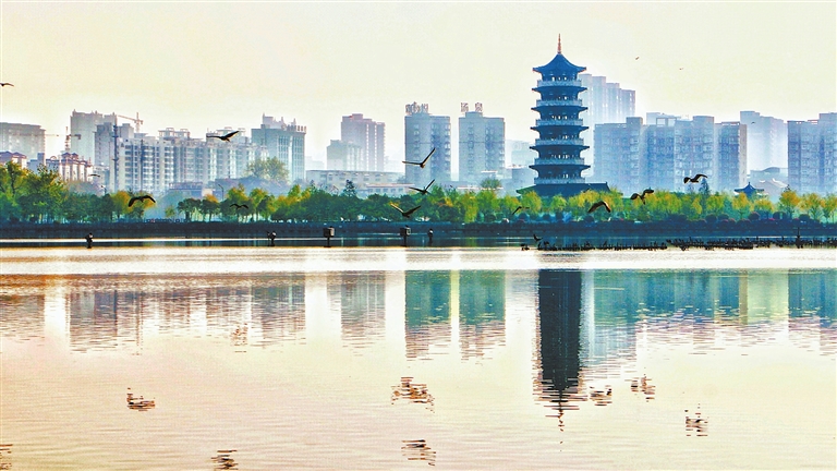 4月7日,河南省柘城縣容湖國家濕地公園旭陽初照,薄霧繚繞,湖面上鷺鳥飛舞,景色一新。近年來,該縣致力打造高品質(zhì)城市綠化空間,讓群眾享受到自然、和諧、生態(tài)的園林綠化建設(shè)成果。(張子斌 攝)