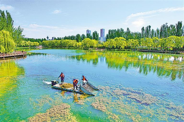 5月8日,銀川市河道管理所的工作人員清撈典農(nóng)河河道內(nèi)的水草。隨著氣溫升高,典農(nóng)河中的水草進(jìn)入生長(zhǎng)繁殖高發(fā)期,大面積生長(zhǎng)的水草不僅會(huì)影響河道景觀(guān),腐爛的水草還會(huì)對(duì)水域造成污染、滋生蚊蠅,影響水域生態(tài)環(huán)境。針對(duì)不同水域水草生長(zhǎng)態(tài)勢(shì),銀川市水務(wù)部門(mén)按照“科學(xué)管控、生態(tài)治理”的原則提前安排,分河段、分時(shí)間對(duì)過(guò)量生長(zhǎng)的水草實(shí)施修剪、打撈清理,讓河水保持清澈,為市民創(chuàng)造良好的宜居環(huán)境。(記者馬楠 王洋 攝)