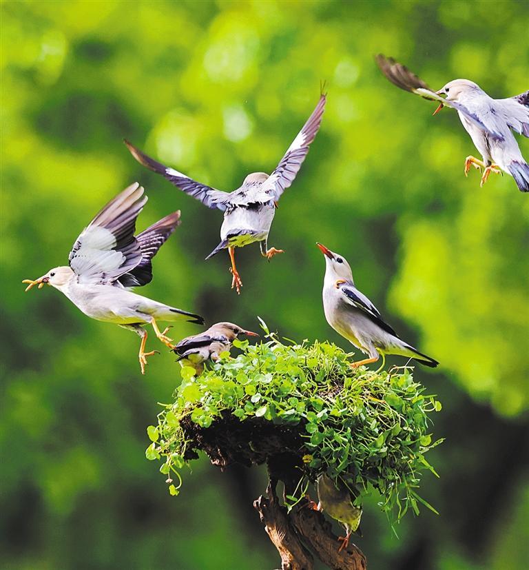 5月19日,上海市寶山區(qū)大華行知公園,絲光椋鳥(niǎo)在覓食嬉戲。成林 攝(中經(jīng)視覺(jué))