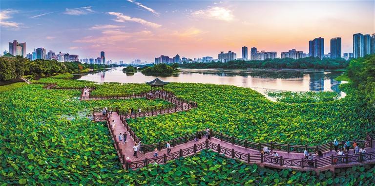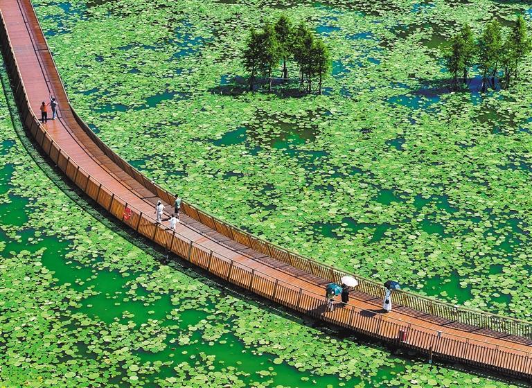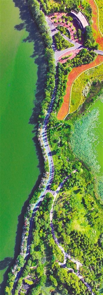 5月29日,俯瞰江西省南昌市華僑城生態(tài)藝術(shù)公園,西堤蜿蜒曲折,綠植郁郁蔥蔥,湖面波光粼粼。陳盛 攝(中經(jīng)視覺(jué))
