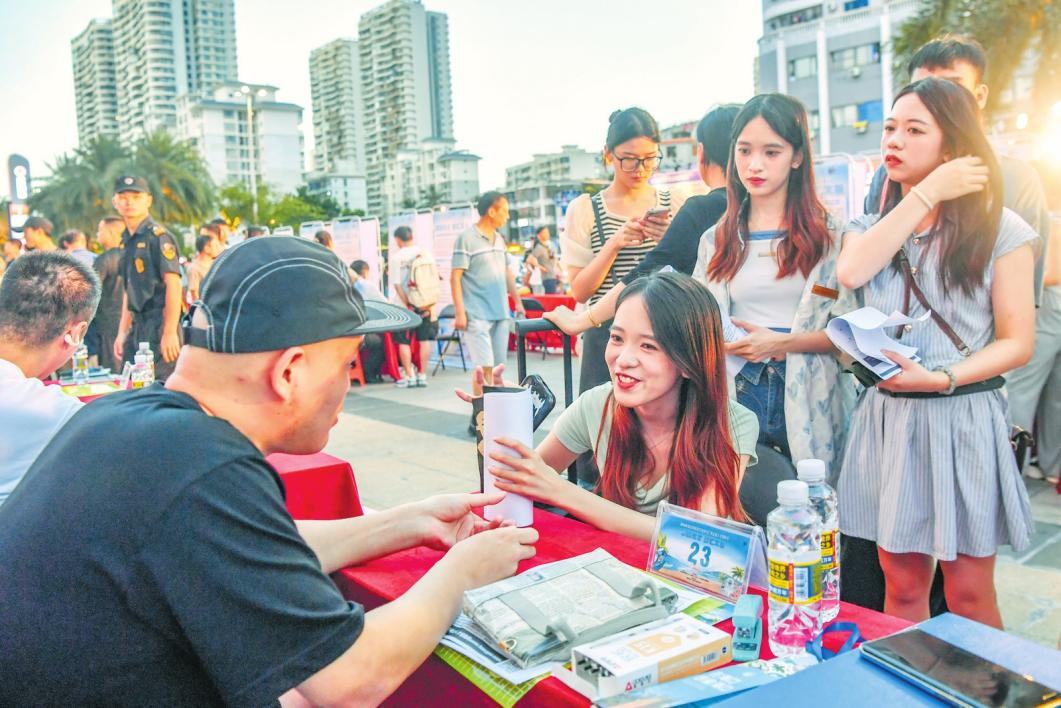 平日逛街休閑的場(chǎng)所,變?yōu)檎匈t納才的“夜市”,招聘“攤主”“挑燈”尋覓人才,求職者在熱鬧的“煙火氣”中邊逛街邊求職。如今,“逛街式求職”在??谠絹碓匠R姟?/p>