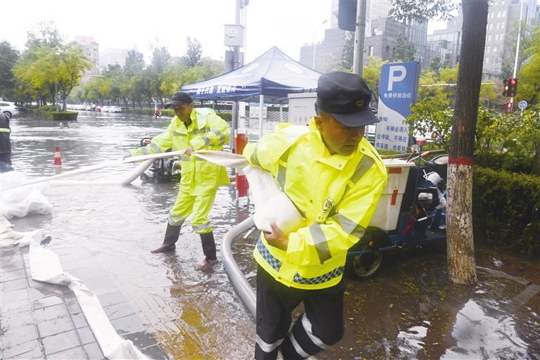 8月8日,銀川市金鳳區(qū)尹家渠北街與宜居巷交叉口路面積水嚴(yán)重,金鳳區(qū)綜合執(zhí)法局上海西路執(zhí)法中隊人員搬運潛水泵、消防栓等抽排水工具排水保暢。 記者 白茹 攝