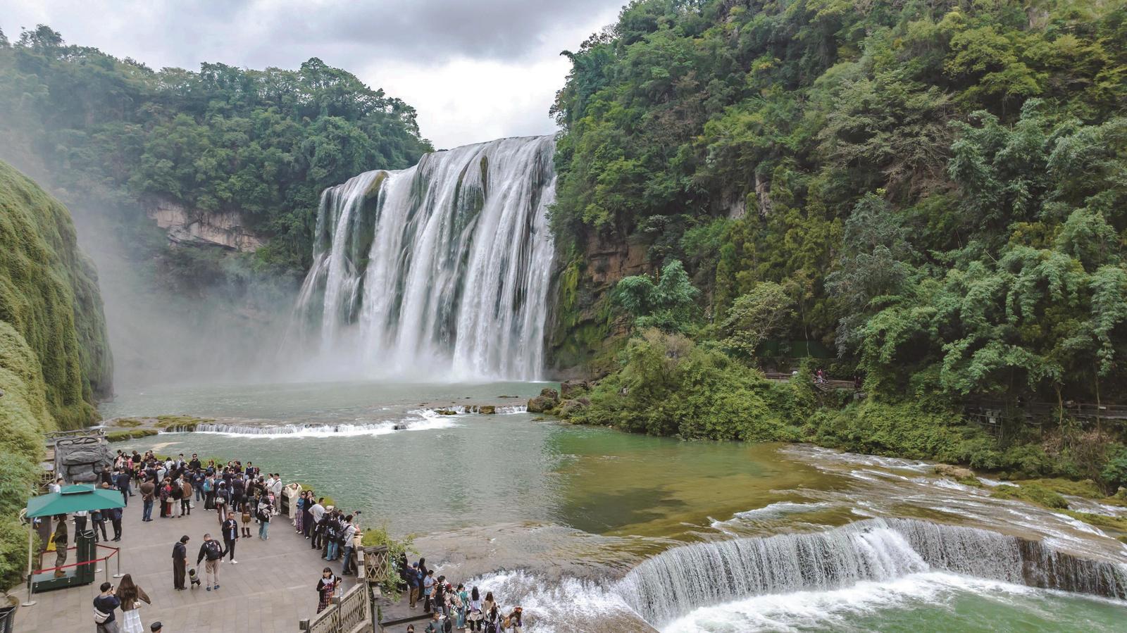 10月7日,游客在貴州省安順市黃果樹瀑布景區(qū)游覽(無人機(jī)照片)。