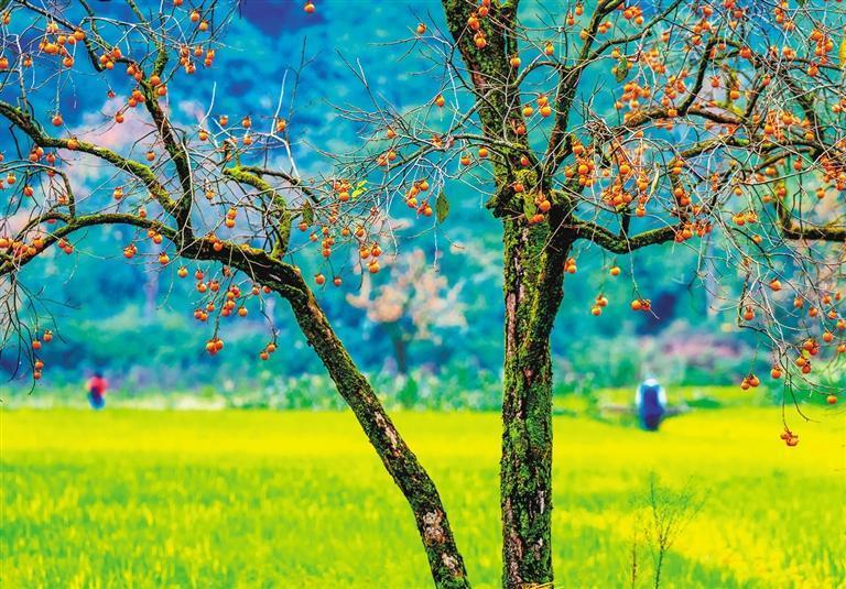 10月9日,浙江省紹興市諸暨市楓橋鎮(zhèn)王村,紅紅的柿子掛滿枝頭,成為秋日里一道亮麗風(fēng)景。潘偉峰攝(中經(jīng)視覺)