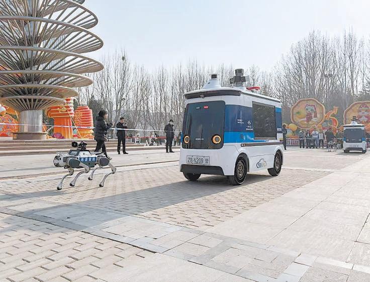 機(jī)器狗與無人駕駛巡邏車在經(jīng)開區(qū)公園內(nèi)巡邏。