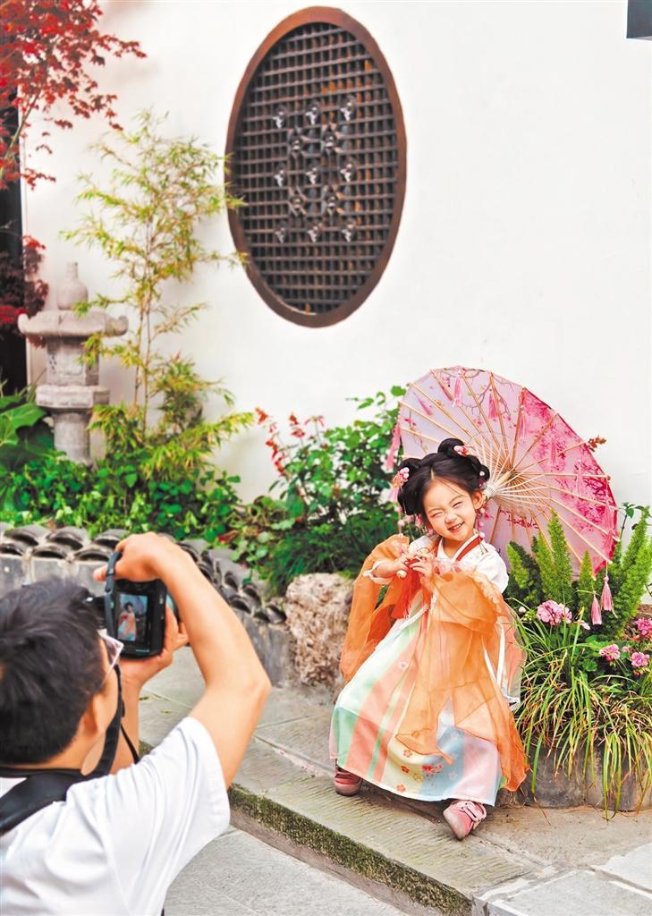 4月5日,小朋友在四川省南充市閬中古城拍照打卡,體驗漢服魅力,樂享假日時光。梁德攝(中經視覺)
