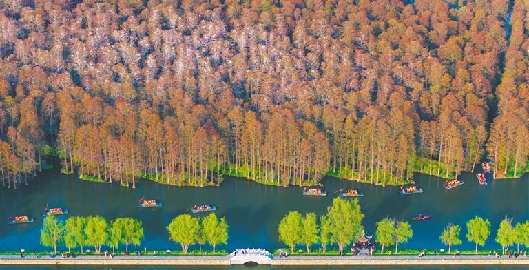 4月5日,江蘇省興化市李中水上森林公園,游客泛舟水上。陸啟輝攝(中經視覺)