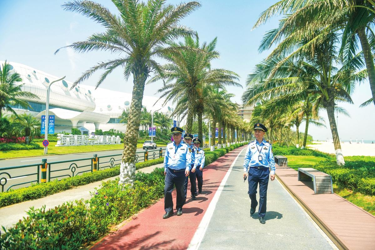 消博會期間,???/span>市綜合行政執(zhí)法局生態(tài)環(huán)境保護(hù)行政執(zhí)法支隊執(zhí)法人員在海色路巡查。