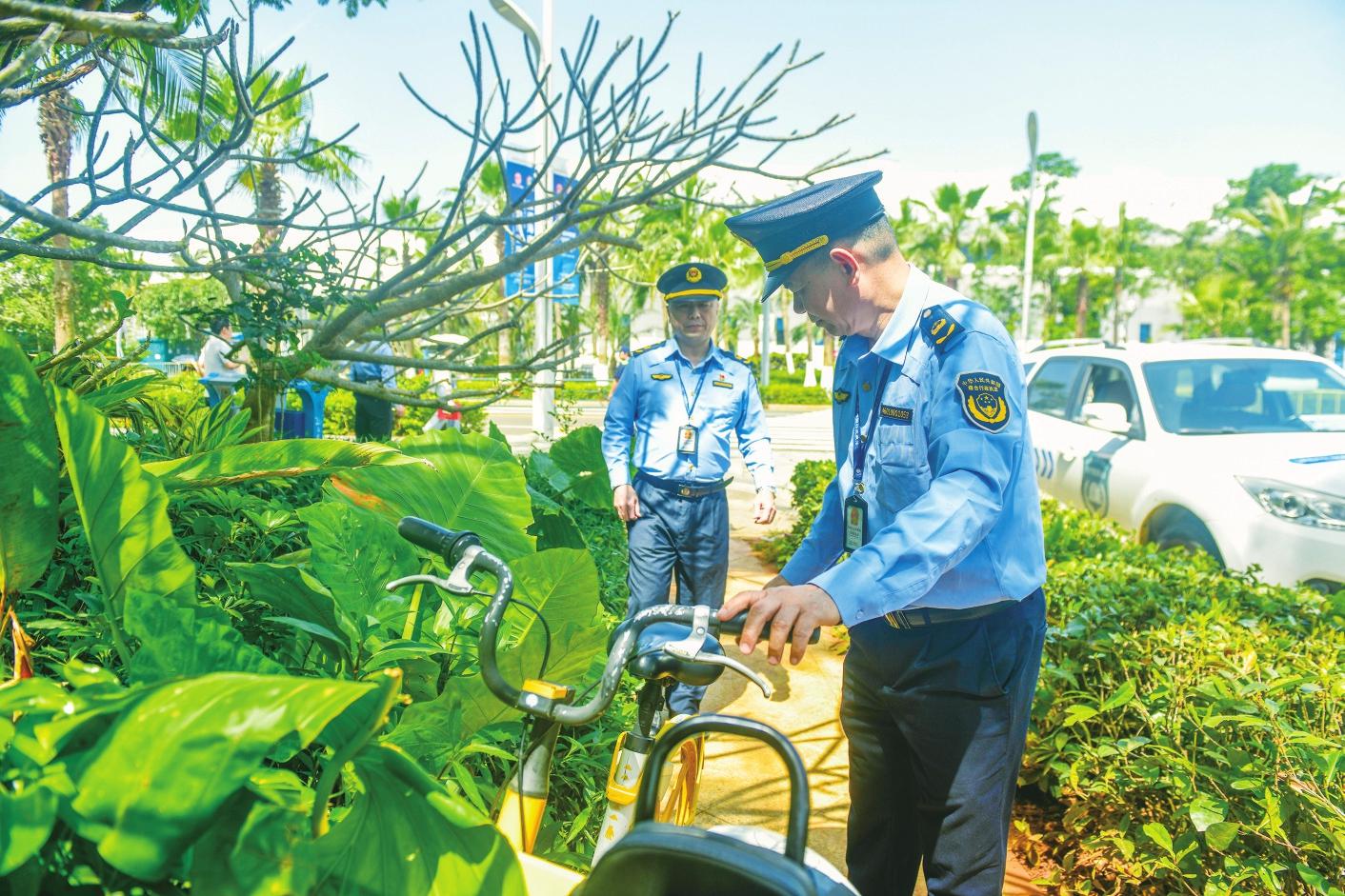 生態(tài)環(huán)境保護(hù)行政執(zhí)法支隊主要負(fù)責(zé)巡控海色路區(qū)域,維持通行秩序,為市民指引路線,清理流動攤販,規(guī)范共享單車和電動自行車的停放秩序。(鄧宇)