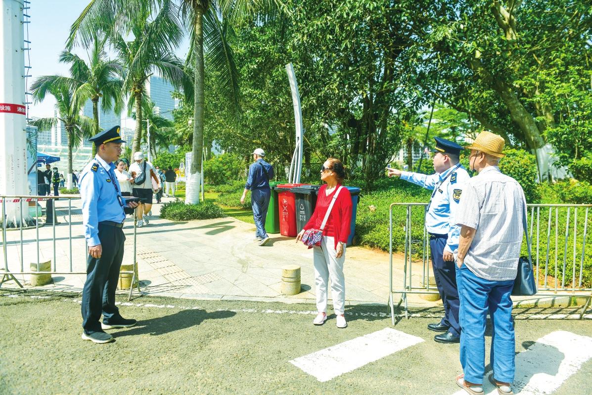 消博會期間,海口市綜合行政執(zhí)法局秀英分局執(zhí)法人員為市民指引道路。