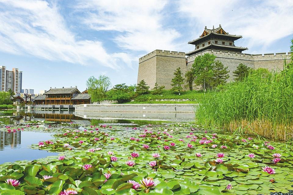 6月7日,在大同城墻帶狀公園東南角,護(hù)城河內(nèi)的大片睡蓮悄然盛開,與岸邊的綠樹、古城墻構(gòu)成一幅動(dòng)靜相宜的美麗畫卷。戎禹仁 攝