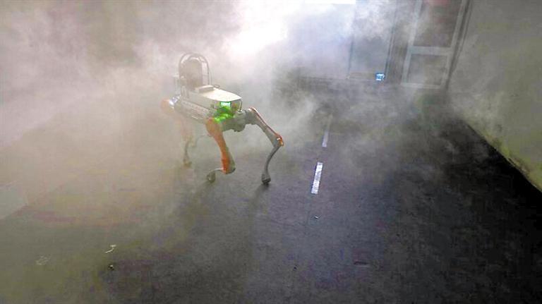 四足機(jī)器人在煙霧中開展搜救,將現(xiàn)場情況實(shí)時(shí)向指揮部進(jìn)行圖傳。深圳市消防救援支隊(duì)供圖