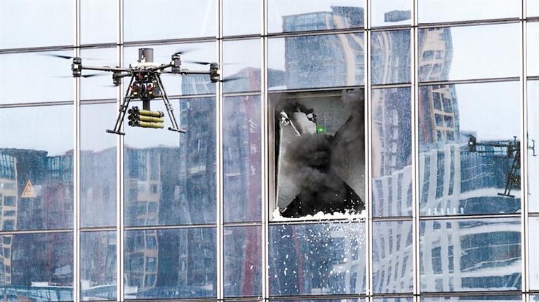 演習(xí)中,破玻無人機(jī)精準(zhǔn)發(fā)射破玻彈擊碎幕墻玻璃,開辟排煙通道。