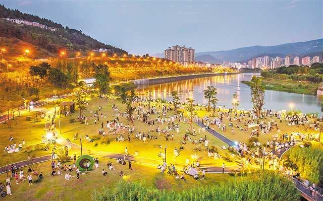 7月13日,夜幕降臨,重慶市開(kāi)州區(qū)濱湖公園夜色迷人,城市、湖水、草坪相映成趣,吸引眾多市民前來(lái)休閑納涼,樂(lè)享綠色健康生活。
