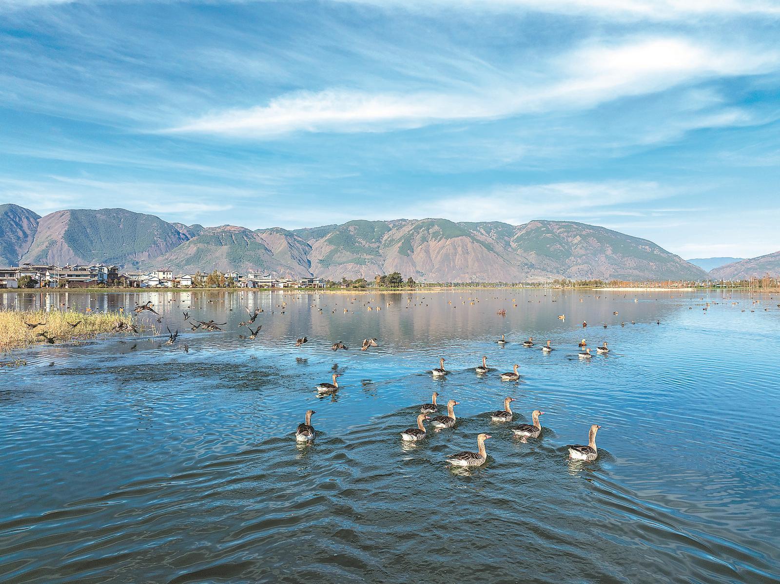 圖為一群灰雁在云南省大理白族自治州洱源縣茈碧湖濕地棲息、覓食。(資料圖片)新華社發(fā)