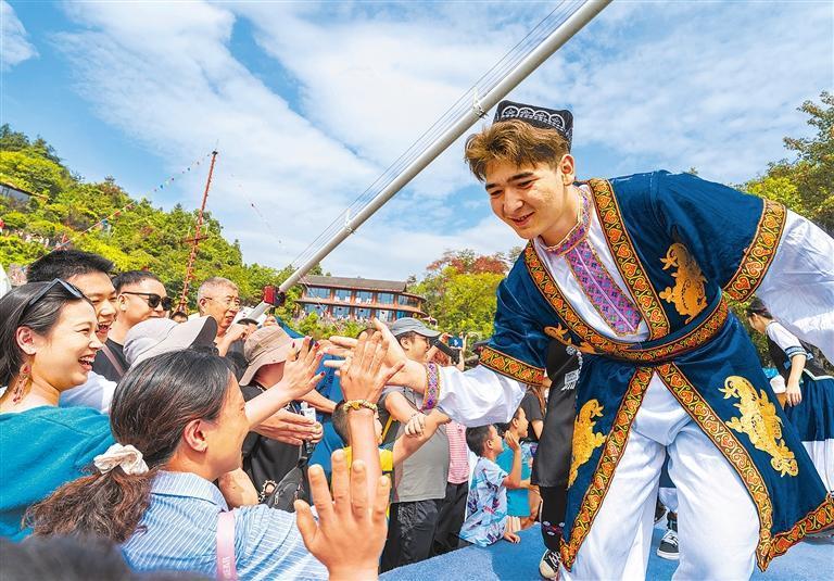 10月3日,湖南省吉首市矮寨大橋景區(qū)上演“56個民族風情盛會”,演員與游客互動,現(xiàn)場十分熱鬧。梁永鴻攝(中經(jīng)視覺)