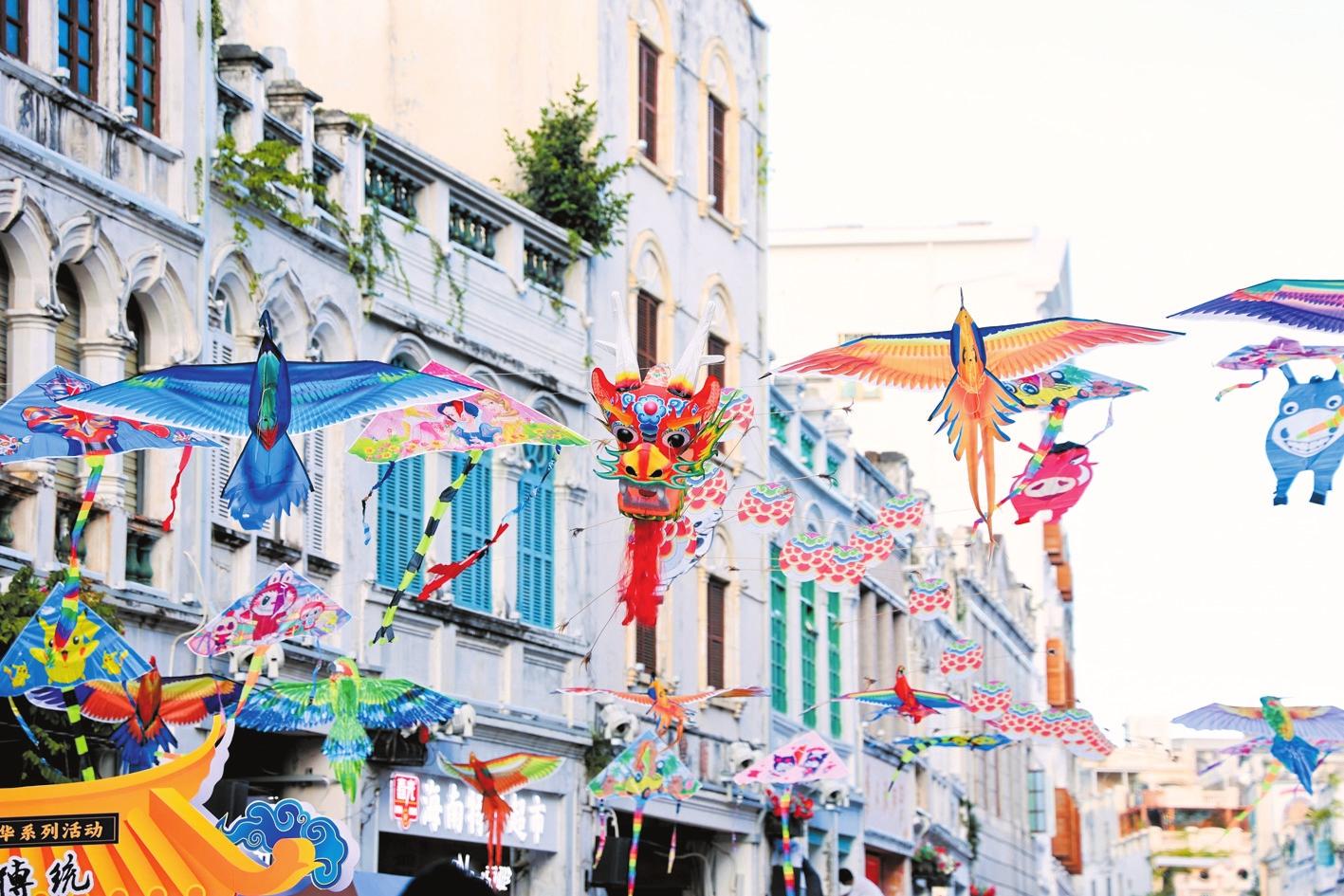 近日,“中國(guó)傳統(tǒng)風(fēng)箏文化展”走進(jìn)??隍T樓老街。圖為各具特色的風(fēng)箏“飛舞”,吸引市民游客駐足欣賞。(組委會(huì)供圖)