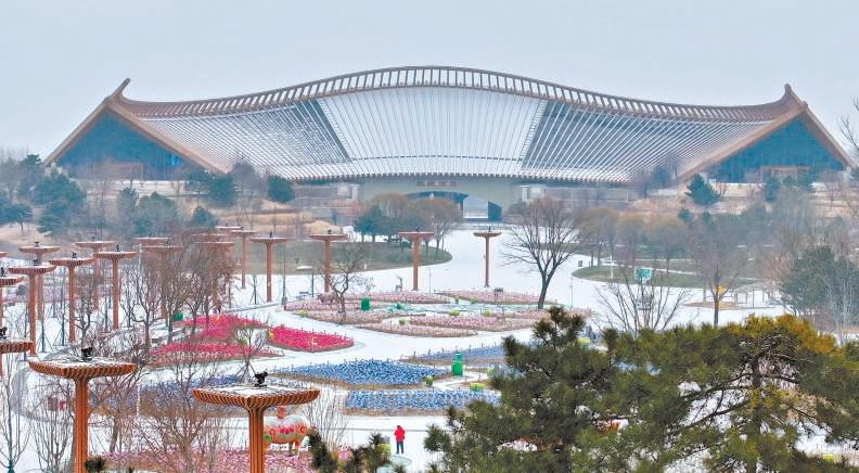 北京延慶世園公園,國(guó)風(fēng)建筑掩映在皚皚雪幕之中。記者 潘之望攝
