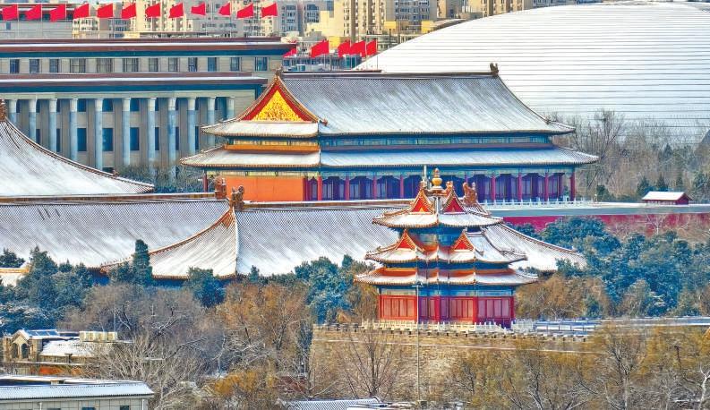 故宮角樓、天安門(mén)城樓、人民大會(huì)堂與國(guó)家大劇院雪中同框。張林平攝