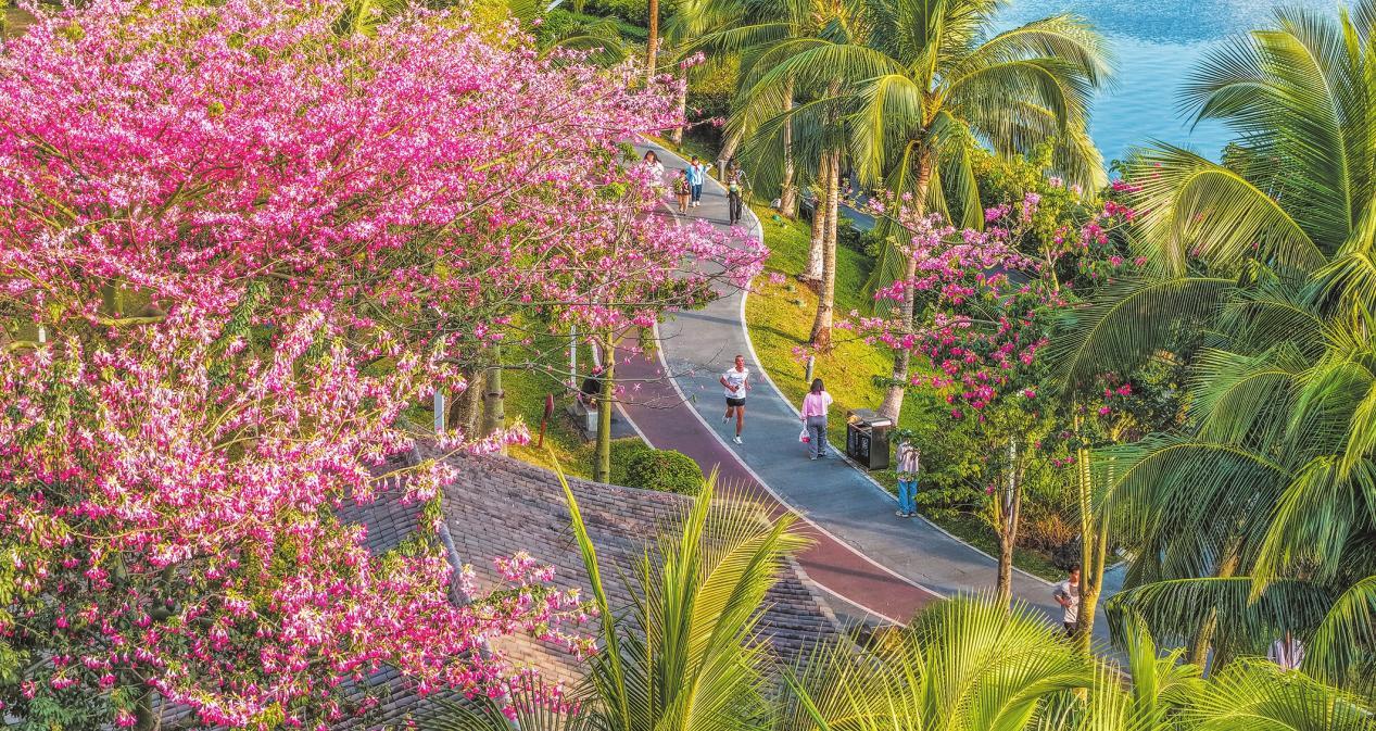 近日,??诩t城湖公園的異木棉進(jìn)入盛花期,滿枝花色絢麗,與椰林、湖岸相映成趣,為冬日添了一筆暖色,也為步道增添了浪漫氛圍。市民游客在其中或慢跑健身、或漫步賞花,一幅人與自然和諧相處的動人畫卷在椰城鋪開。(記者 康登淋 攝)